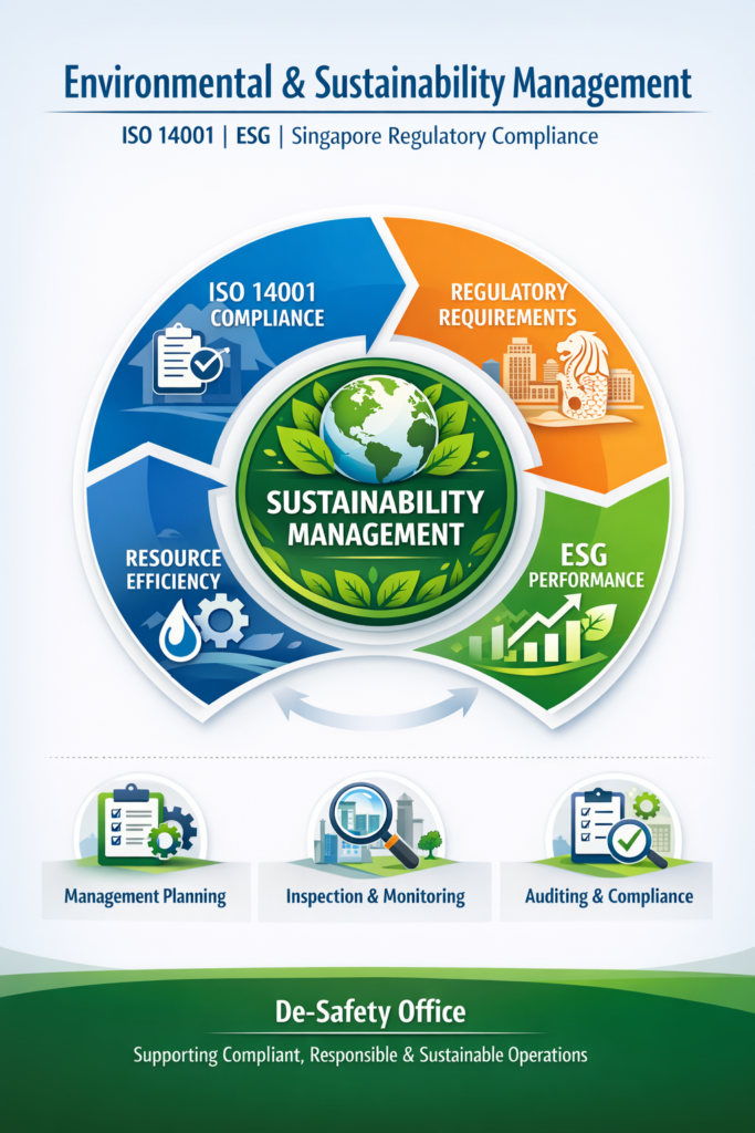 Within the Singapore context, sustainability management supports compliance with regulations and guidelines issued by authorities such as NEA, MOM, PUB, BCA, and SCDF, while contributing to national sustainability and ESG goals.